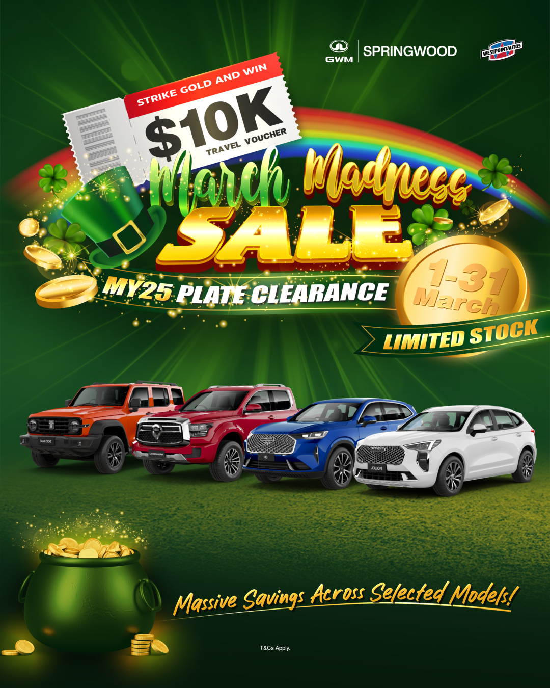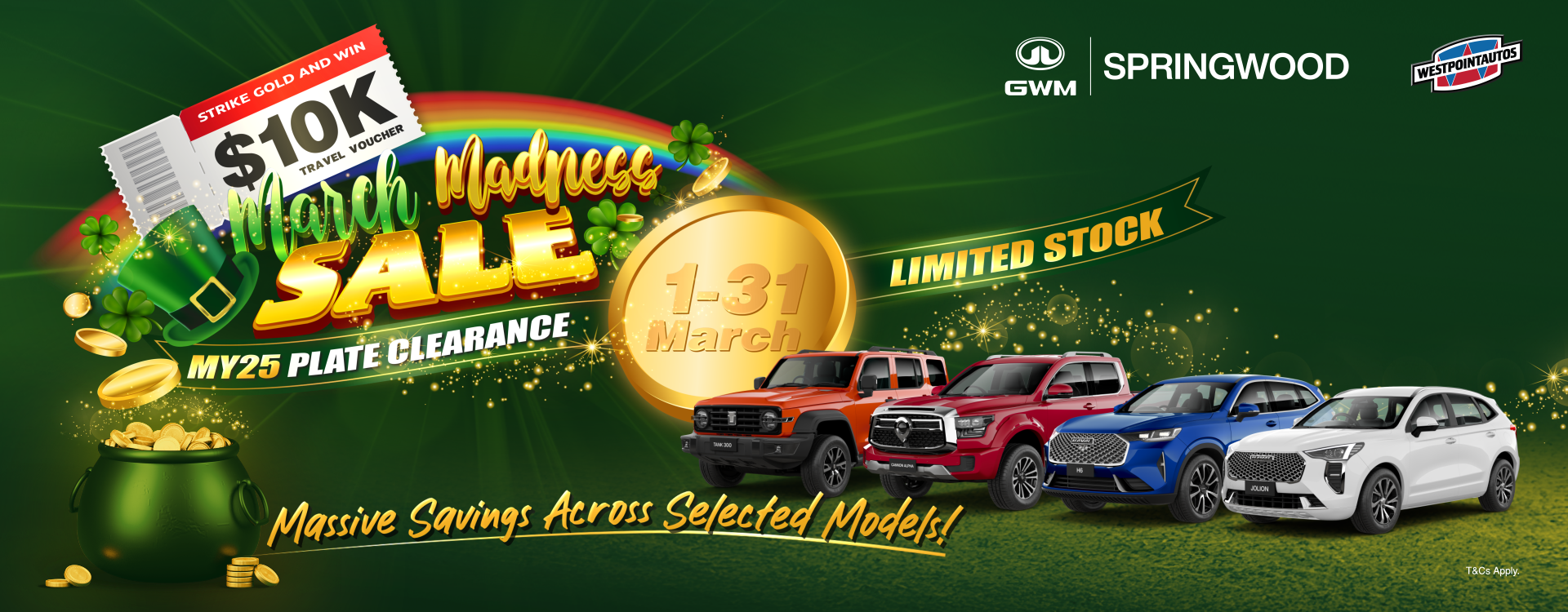 *Terms & Conditions apply. This promotion is conducted by Westpoint Autos Springwood GWM of 3480 Pacific Hwy, Springwood (“the Promoter”) and is open to Queensland residents aged 18 years or over, excluding employees of the Promoter and their immediate families, as well as ABN holders purchasing in a business capacity, fleet, rental or government buyers. The promotion commences at 12:00am AEST on 1 March 2026 and closes at 11:59pm AEST on 31 March 2026 (“Promotion Period”). To be eligible, customers must purchase any new or demonstrator (demo) MY25 Plate model vehicle from the Promoter and take delivery of the vehicle between 1 March 2026 and 31 March 2026. Eligible retail customers will automatically receive one (1) entry into the prize draw, with strictly one (1) entry permitted per customer regardless of the number of vehicles purchased. The prize is one (1) $10,000 AUD travel voucher. The voucher supplier will be determined by the Promoter and the prize is not transferable, exchangeable or redeemable for cash. The draw will take place at the Promoter’s premises on 1 April 2026. The winner will be selected at random and notified by phone and/or email within two (2) business days of the draw. If the winner cannot be contacted within fourteen (14) days, the Promoter reserves the right to conduct a redraw. The Promoter reserves the right to verify the validity of entries and to disqualify any entrant who tampers with the entry process. The Promoter’s decision is final and no correspondence will be entered into. If for any reason this promotion is not capable of running as planned, the Promoter reserves the right to modify, suspend or cancel the promotion, subject to any directions from a regulatory authority. By participating in this promotion, entrants agree to be bound by these Terms and Conditions.
